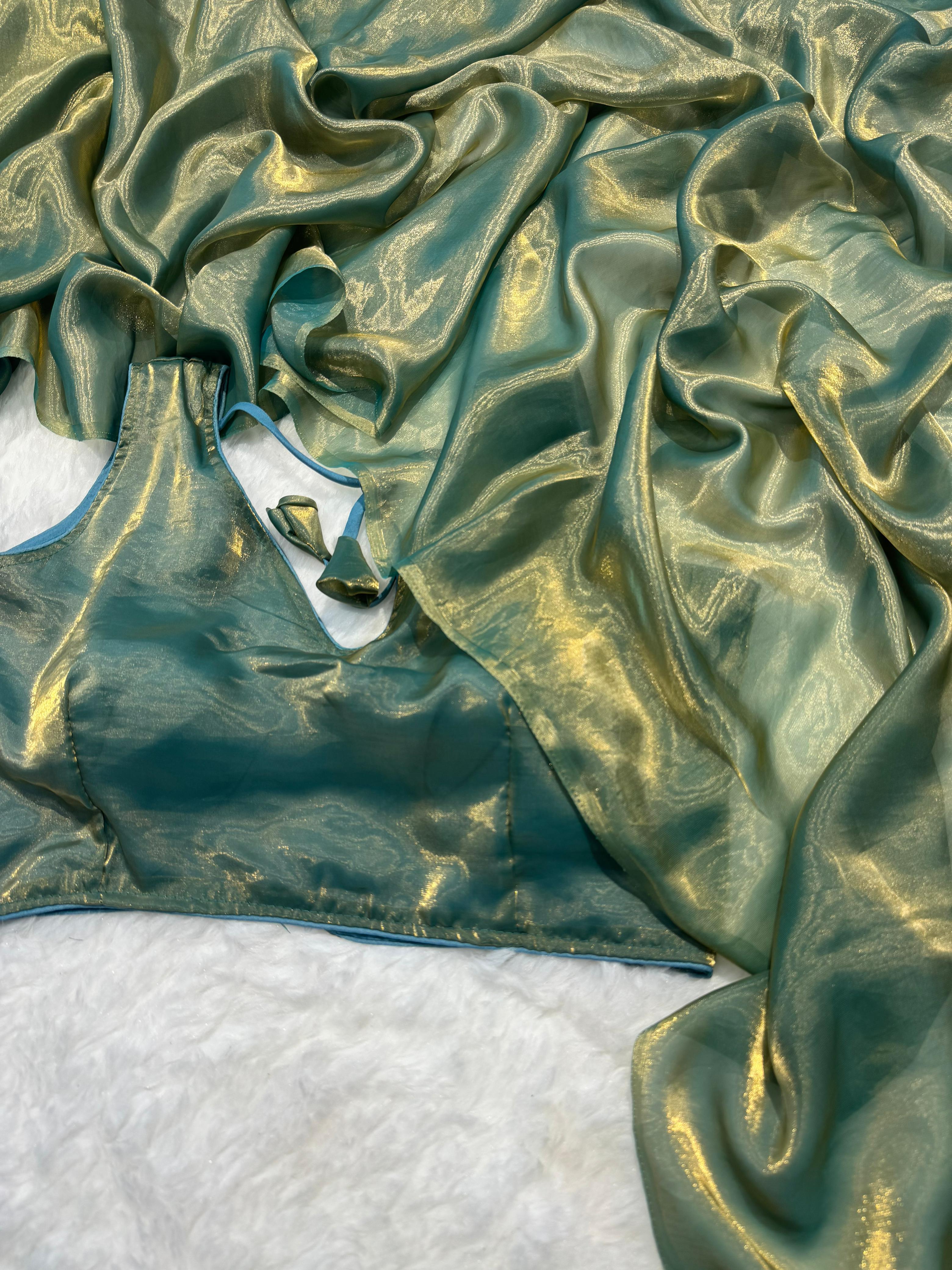 The rich radiates sophistication, while the smooth silk fabric drapes effortlessly, giving you a regal silhouette. Paired with a perfectly stitched matching blouse, it offers a ready-to-wear experience ideal for festive occasions, parties, and celebrations.