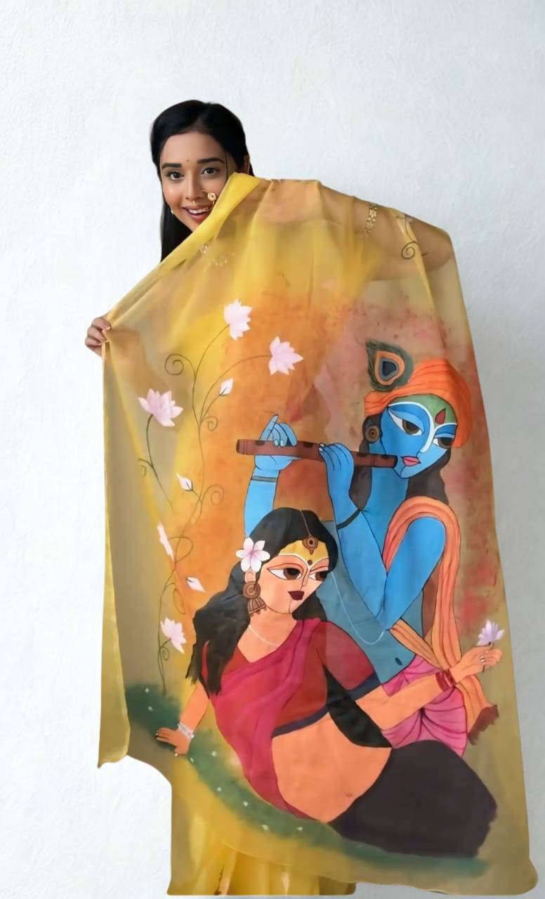 Step into timeless elegance with the CLOVIRA Yellow Pure Organza Ready-to-Wear Saree, crafted to combine effortless draping with exquisite beauty. This saree features a vibrant Radhe Krishna digital print in stunning color combinations, giving it a luxurious and graceful appeal — perfect for festive occasions, casual gatherings, and elegant parties.