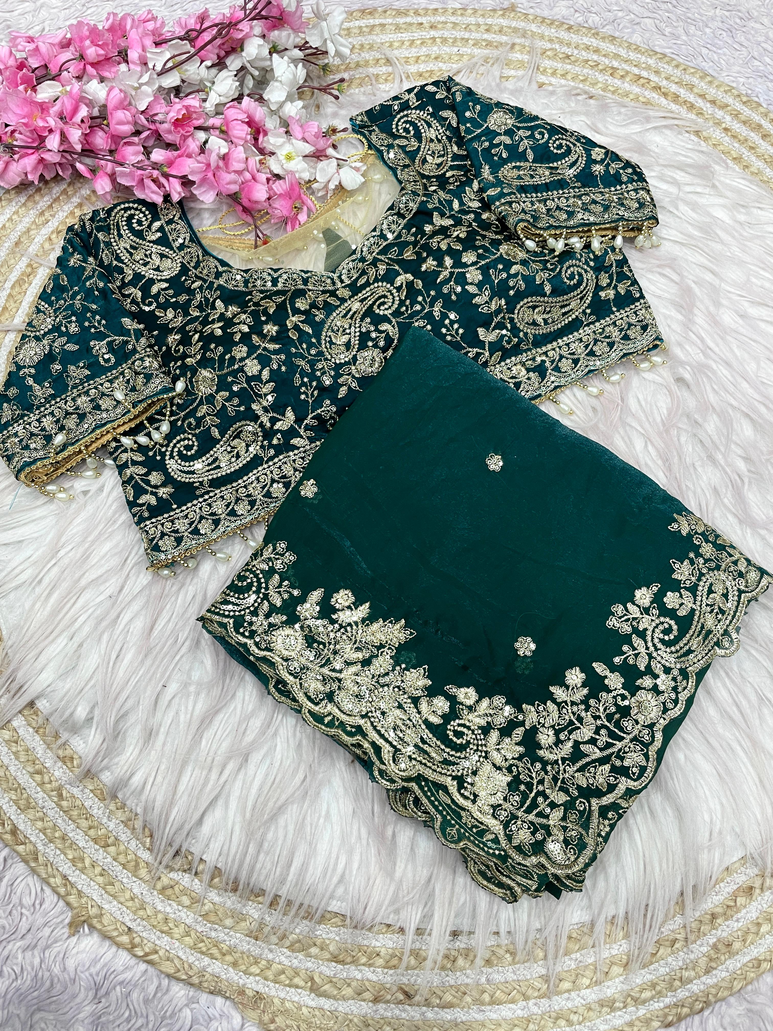 The saree also showcases beautiful sequence butti work all over the body, adding sparkle and sophistication perfect for weddings, receptions, festive occasions, and premium celebrations.