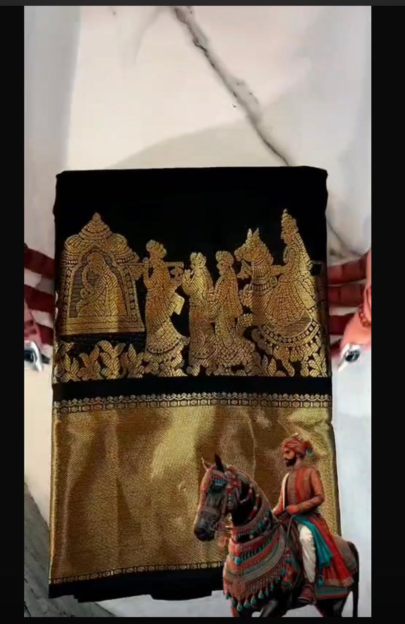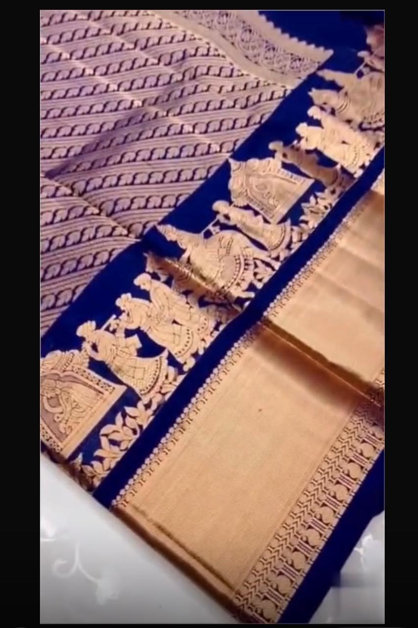 Step into timeless elegance with our Raja-Rani Soft Kanchipuram Pure Silk Saree, beautifully adorned with golden zari jacquard work. The rich maroon/blue/black hue paired with intricate weaving reflects true Kanchipuram craftsmanship, giving you a regal and sophisticated look for any special occasion.