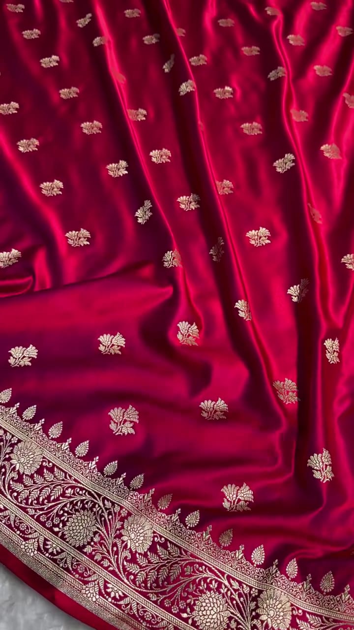 The rich deep maroon base is beautifully adorned with golden zari floral butta motifs, creating a striking contrast that exudes opulence. Elevating its grandeur further, the saree showcases an intricately woven golden zari border and pallu, highlighted with elegant floral and paisley patterns that reflect exceptional craftsmanship.